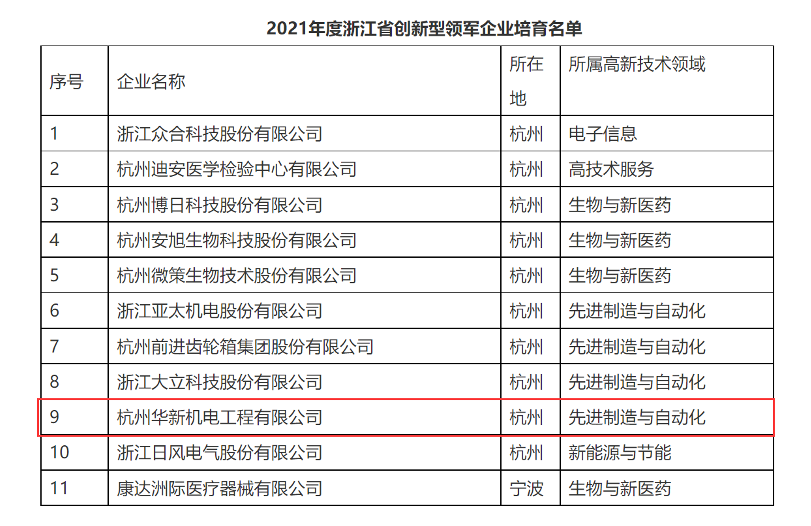 近日,浙江省科学技术厅发布了《关于公布2021年浙江省创新型领军企业名单的通知》,华新机电凭借持续提升的自主研发与科技创新实力,成功入选“2021年度浙江省创新型领军企业”培育名单。